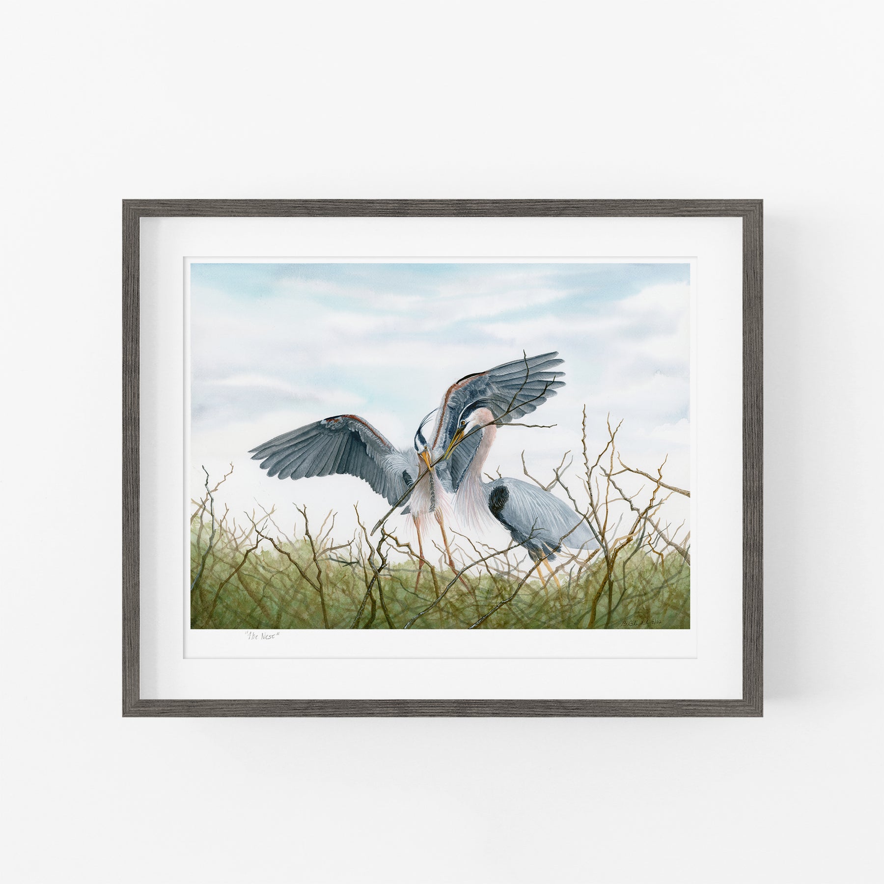 "Le nid" est ma première œuvre d'art. L'aquarelle représente un héron bleu femelle et un héron bleu mâle construisant leur nid pour leur famille. J'ai eu la chance de prendre la photo de référence utilisée pour la peinture et elle a été prise dans les zones humides de Wakodahatchee à Delray Beach, en Floride.