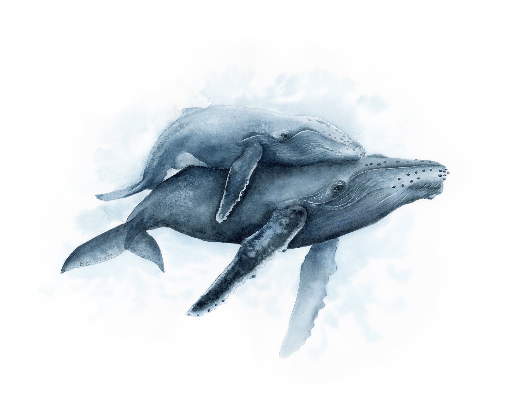 Painted in watercolor on 300gsm 100% cotton rag paper, this piece reflects both the grace and vulnerability of these gentle giants. Layers of blues and subtle movement in the washes evoke the rhythm of the sea — calm yet powerful, eternal yet fleeting.